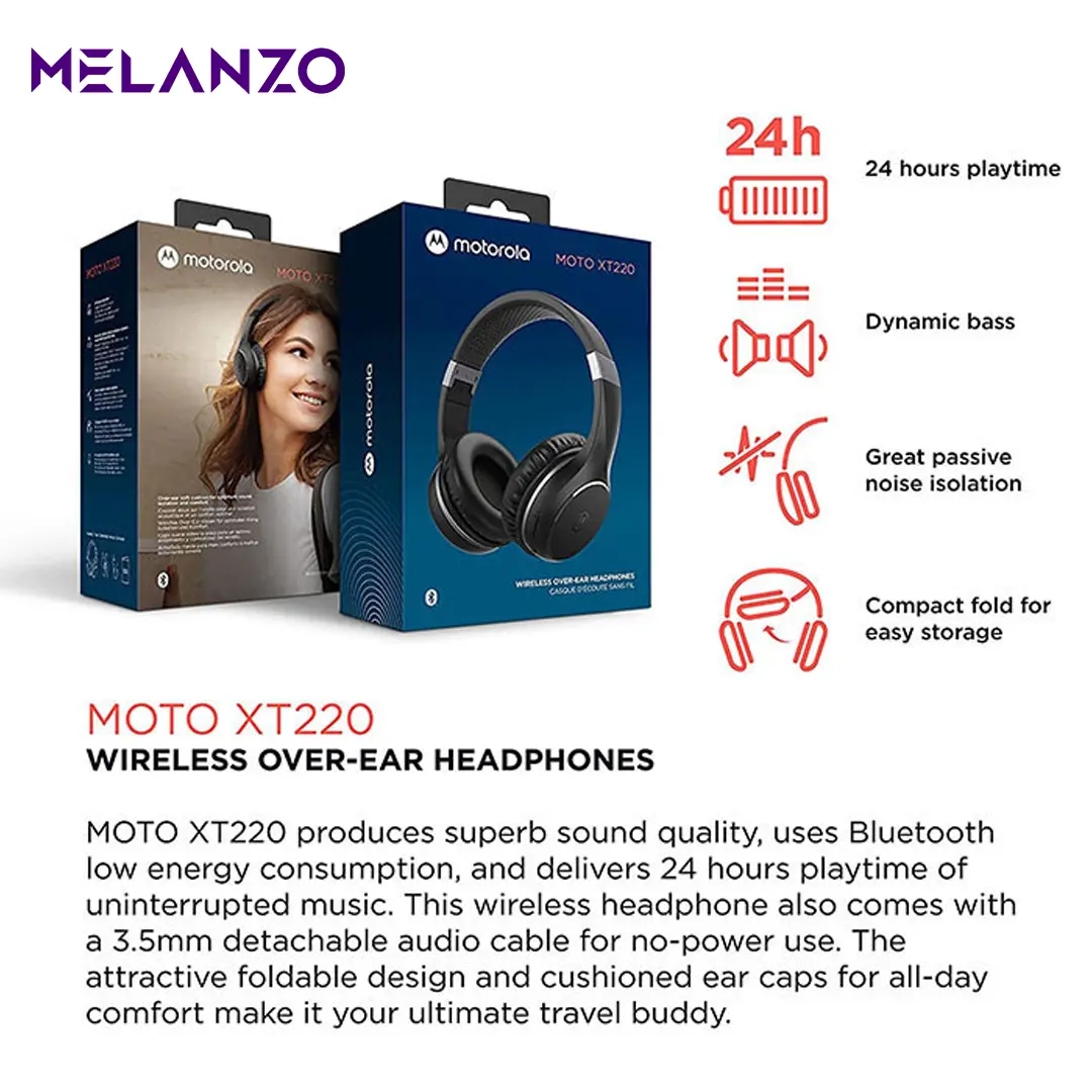 هدفون Motorola XT220 همراهی عالی برای موسیقی‌دوست‌ها است. با درایور ۴۰ میلی‌متری صدایی شفاف و باس قوی به همراه عایق صوتی طبیعی ارائه می‌دهد. اتصال بلوتوث با برد تقریباً ۱۰ متر آزادی حرکت بیشتری می‌دهد و در عین حال می‌توانی با کابل ۳٫۵ میلی‌متری هم در حالت بی‌برقی از آن استفاده کنی. باتری قدرتمند امکان پخش تا ۲۳ ساعت موسیقی یا ۲۴ ساعت مکالمه را می‌دهد و شارژ کامل در ۲ ساعت انجام می‌شود. وزن سبک ۱۶۳ گرم همراه طراحی تاشو، حمل و نگهداری را ساده کرده است. کلیدهای کنترل روی هدفون امکان تنظیم موسیقی و پاسخ به تماس را بدون دست زدن به موبایل فراهم می‌کنند. اگر دنبال هدفونی باشی که هم تلکام سبک باشد، هم عملکرد خوب صوتی، XT220 یکی از گزینه‌های ارزشمند است.